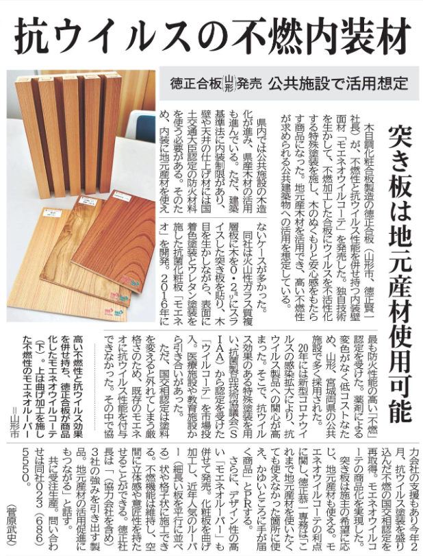 不燃性、抗ウイルス性を併せ持つ「モエネオ ウイルコーテ」、公共施設での活用に期待が高まっています。6月21日の山形新聞で掲載されました。