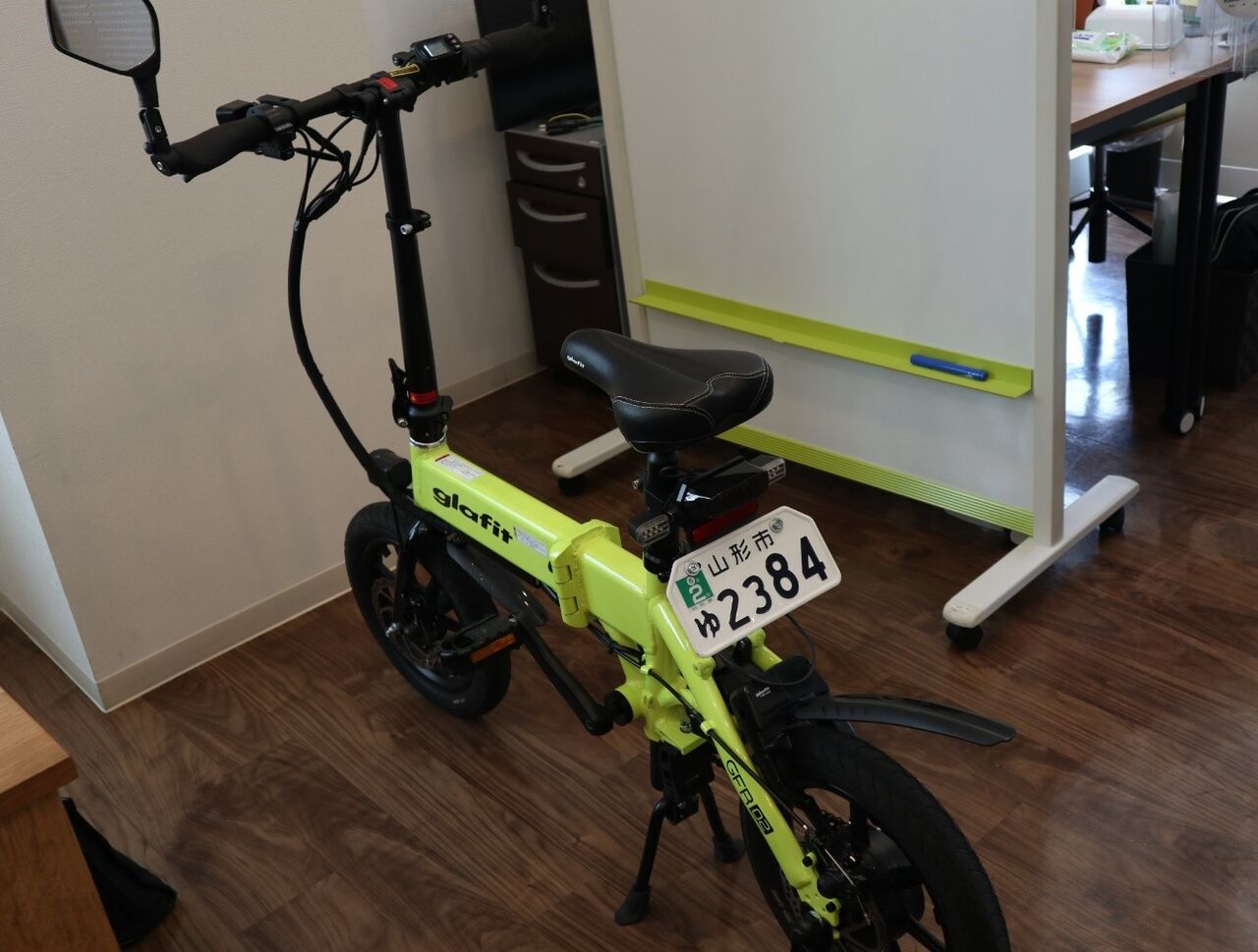 山形パナソニックさんでは、「e-Apple」に続き、最新モビリティ「glafit(グラフィット)ハイブリッドバイクGFR02」の販売を今春スタートされました。この「glafit」は、バイクとして走行することも、ペダルを漕いで電動アシスト付自転車のように乗ることもできる、自転車とバイクのイイトコ取りをしたハイブリッドバイクです。もちろん、走行時の二酸化炭素排出量はゼロ。