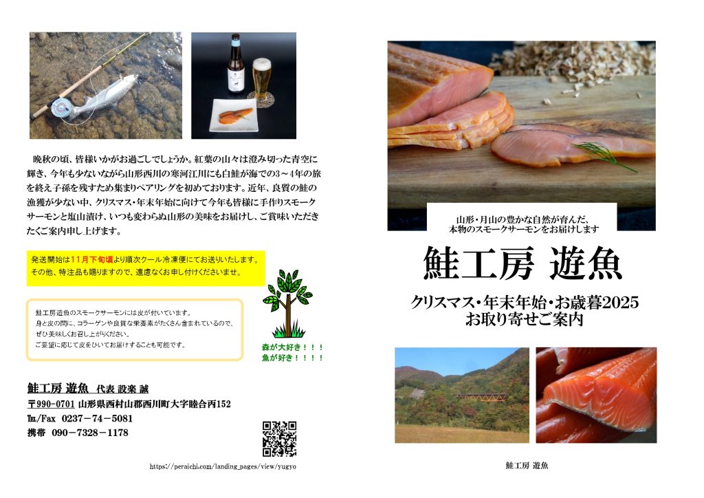 雄大な自然に囲まれた西川町から、極上の素材を使った手づくりスモークサーモンの贈り物。「鮭工房 遊魚」さんの2025年冬カタログが完成しました!