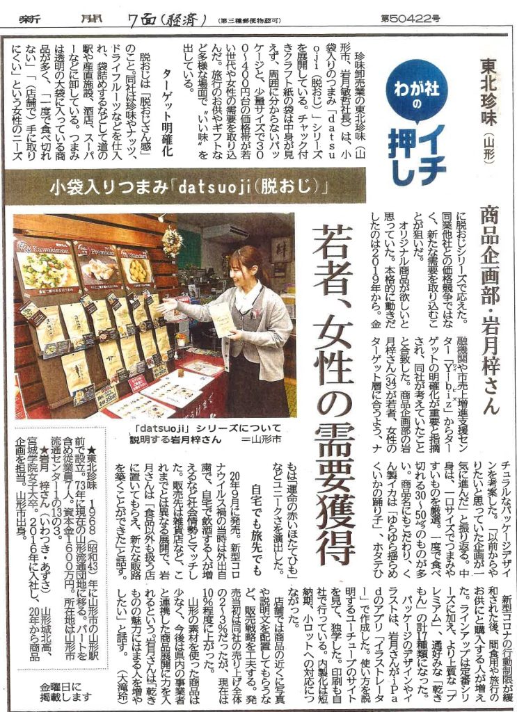 若者・女性を中心に支持を広げる、東北珍味さんの「datsuoji(脱おじ)」が山形新聞さん「わが社のイチ押し」でご紹介されました。