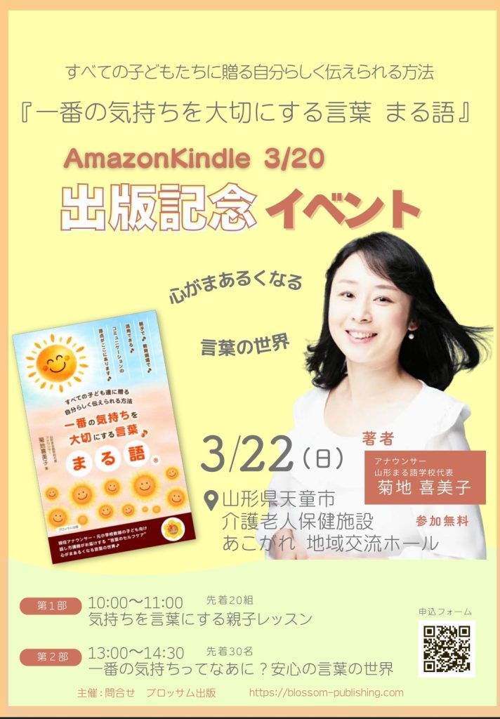 言葉の学校「山形まる語学校」代表で、フリーアナウンサーの菊地喜美子さんが、ご自身が考案した、思いやりを大切にした言葉「まる語」をテーマにした書籍『一番の気持ちを大切にする言葉♪まる語』を、Amazon Kindleより3月20日(金・祝)に発売されます。